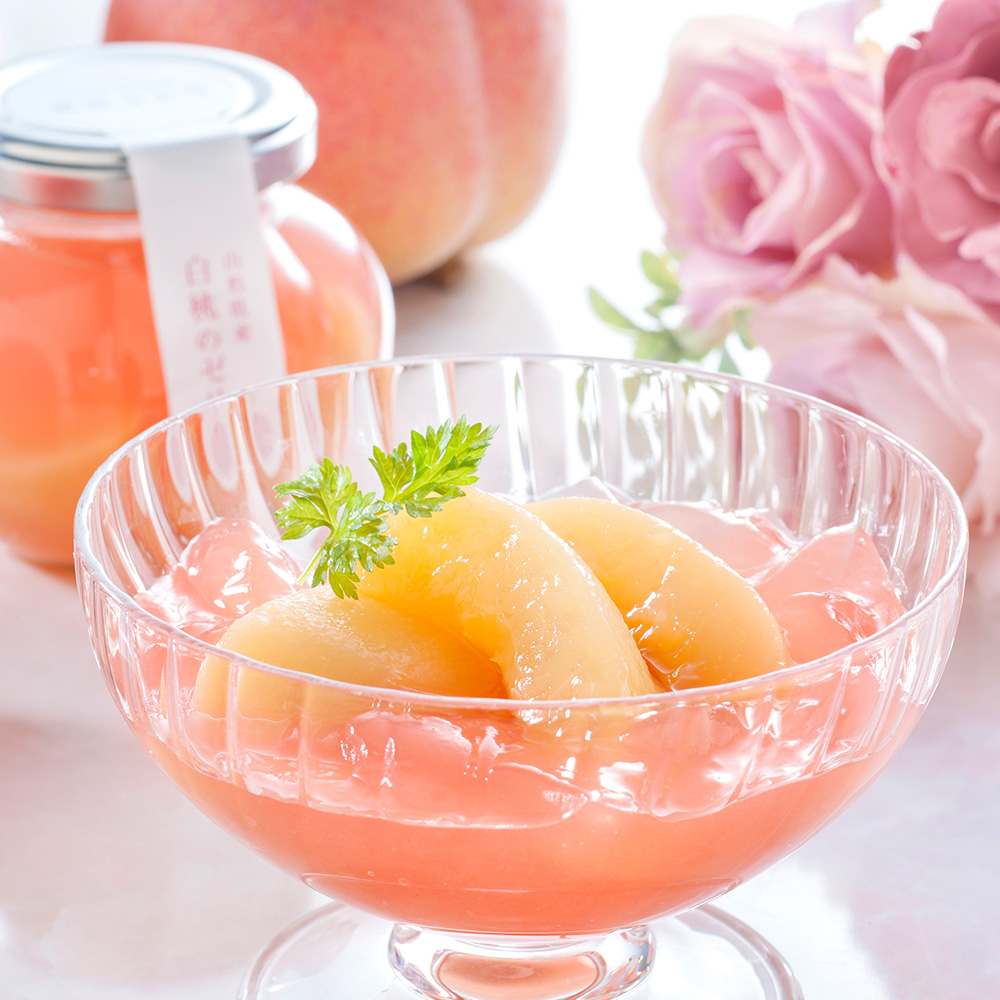 今回お届けする「山形県産白桃のゼリー」は、桃の形をイメージした瓶の中に、大きめにカットした山形県産白桃の果肉と白桃のピューレで作ったゼリーを閉じ込めました。