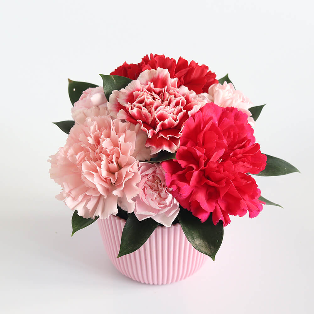 淡いピンクから赤の王道カラーでまとめたカーネーションのアレンジメントです。