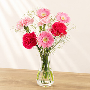 可愛らしいピンクのガーベラと2色のカーネーションの花束です。正統派のピンクの花束は華やかな印象でお祝いの席にぴったりです。