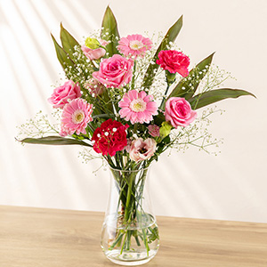 バラとガーベラを主役にトルコキキョウ、カーネーションをピンクのグラデーションでまとめた花束です。正統派のピンクのブーケは華やかな印象でお祝いの席にぴったりです。